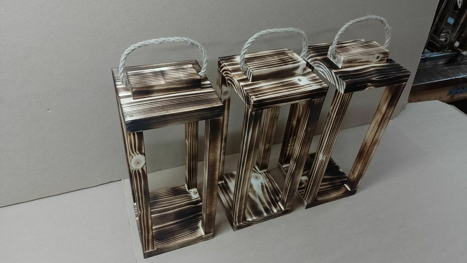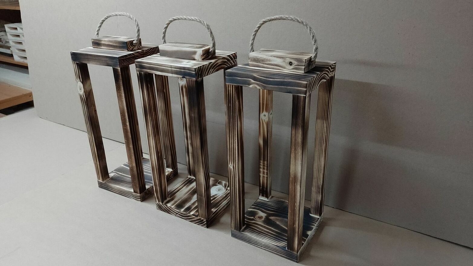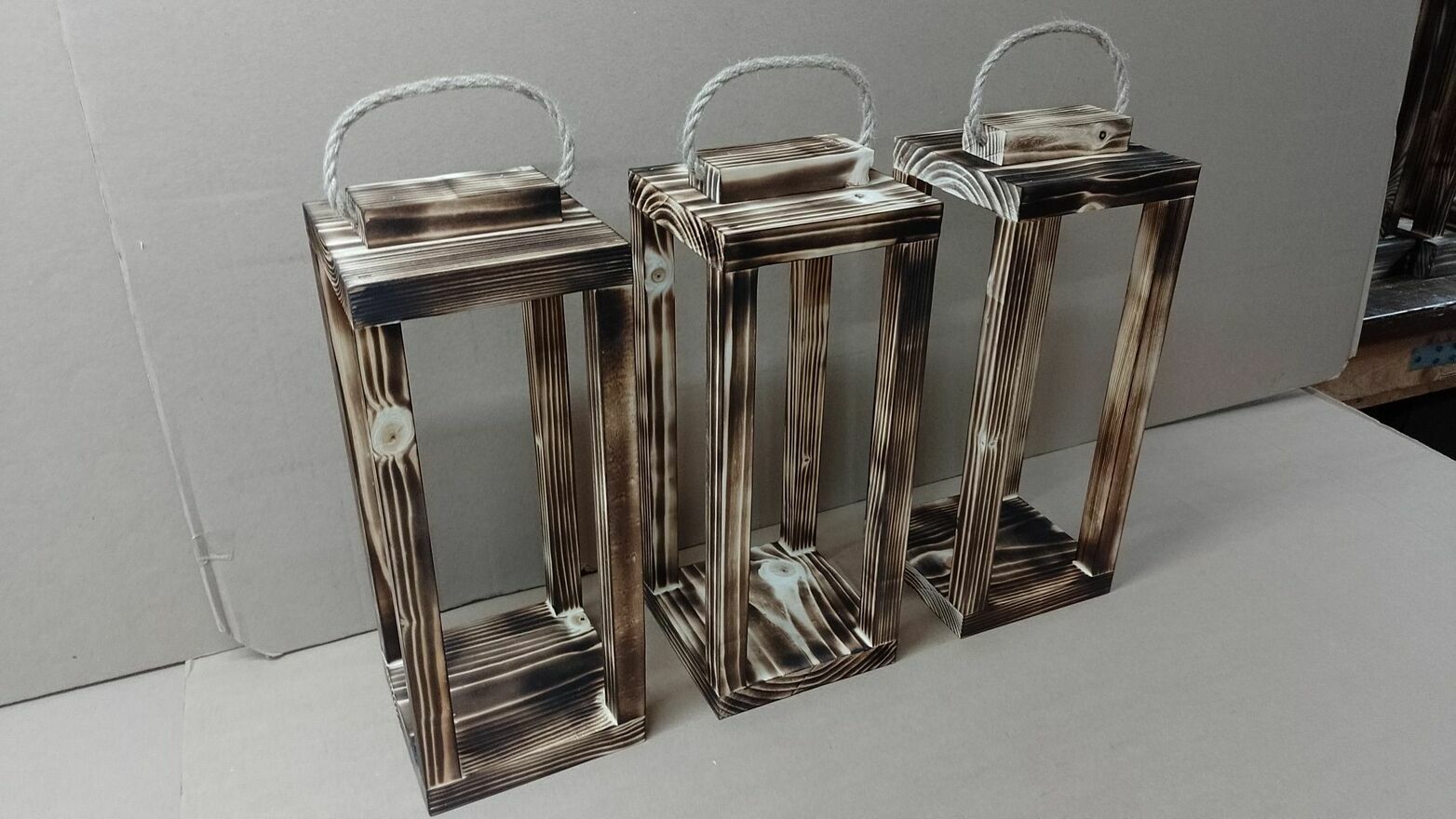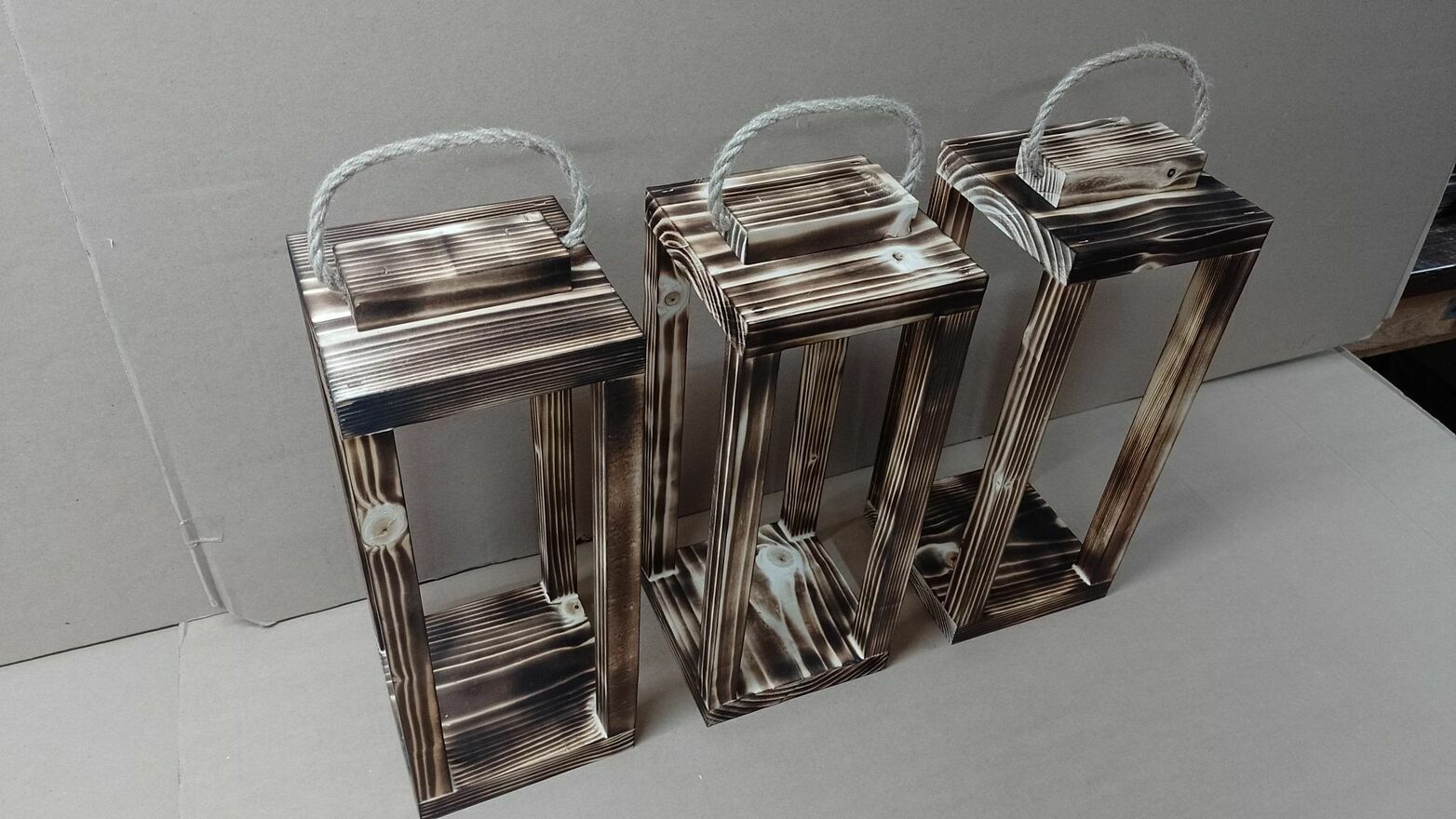 Lampion drewniany ok 36cm wysoki, podstawy ok 14x14cm. OPALANY.Oferuję własnoręcznie wykonane lampiony z drewna po suszarni, produkt mojej produkcji nie masowej więc lepiej wykonany i wykończony.