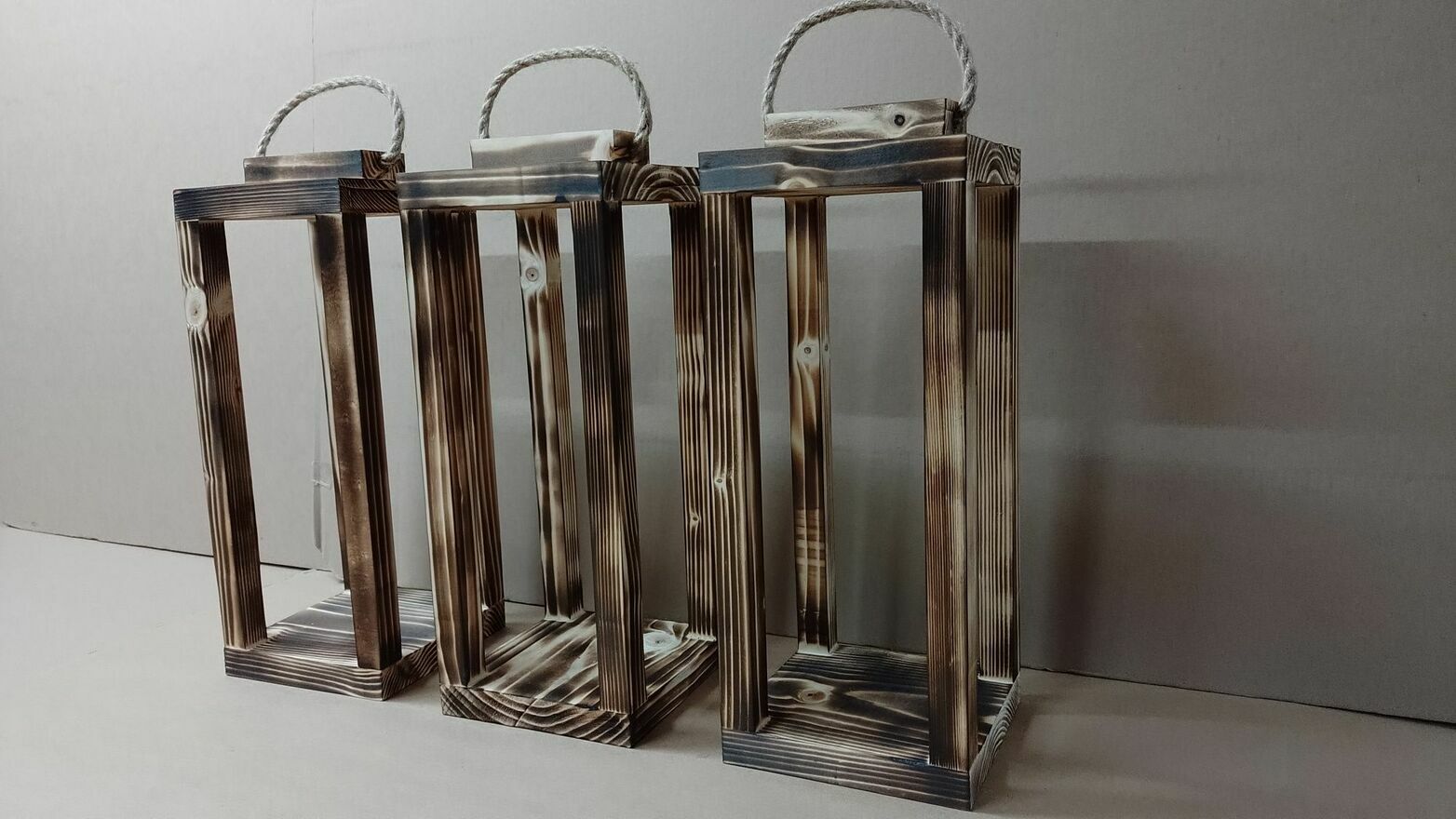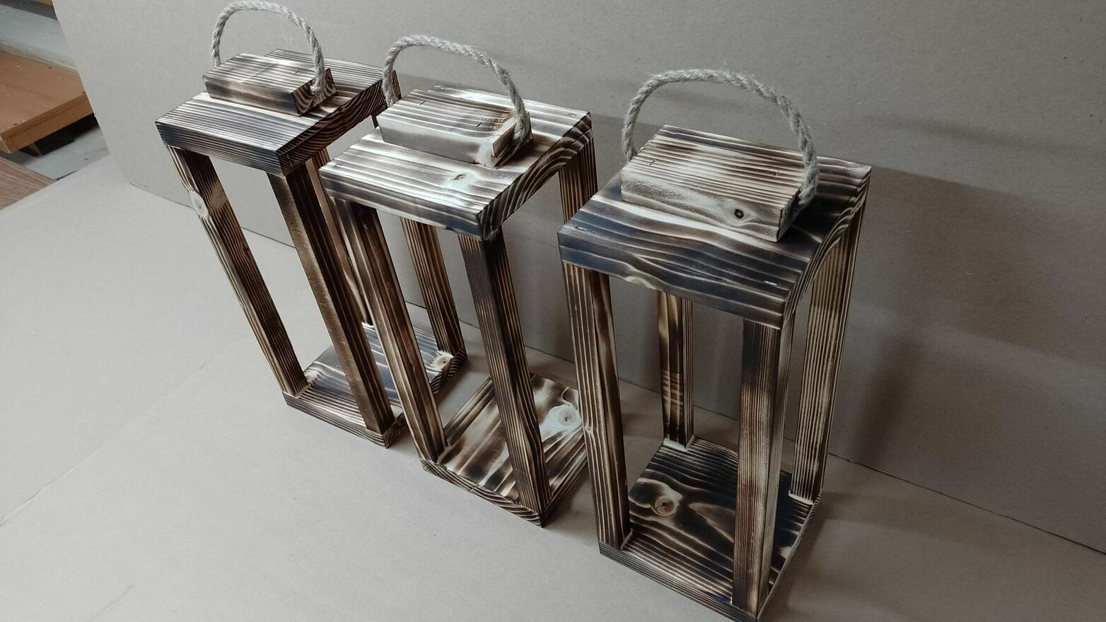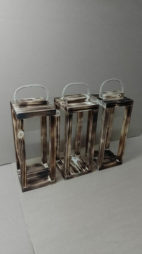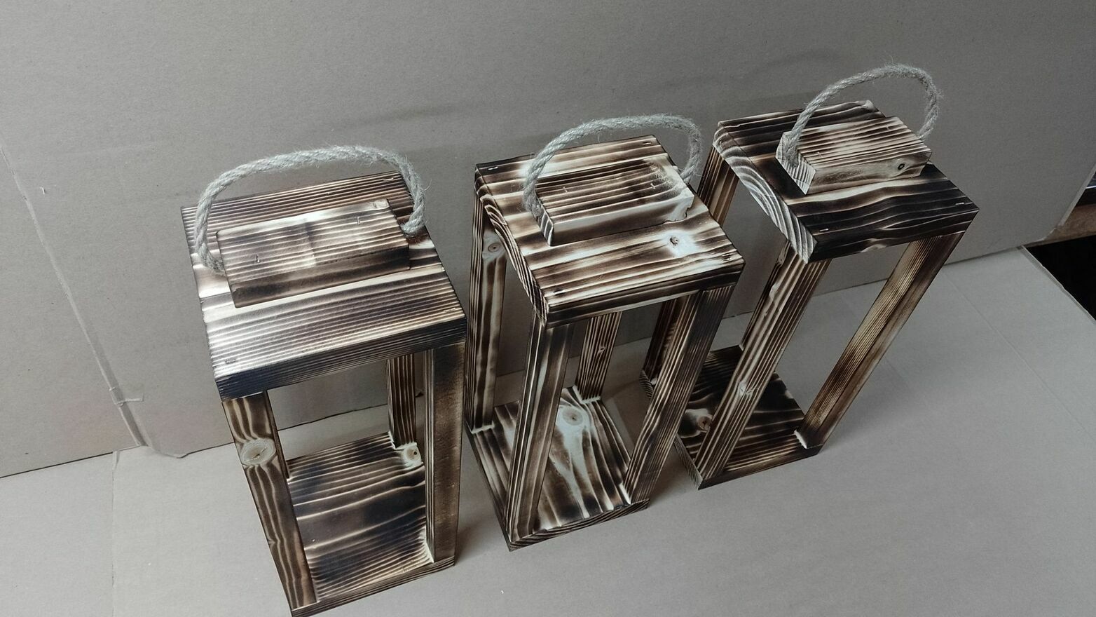 Lampion drewniany ok 36cm wysoki, podstawy ok 14x14cm. OPALANY.Oferuję własnoręcznie wykonane lampiony z drewna po suszarni, produkt mojej produkcji nie masowej więc lepiej wykonany i wykończony.